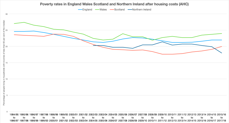 The following chart shows the rates of official poverty rates in the four countries of the UK over the past 25 years.[2]